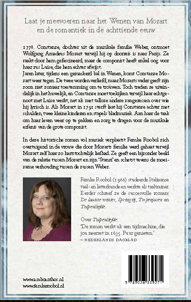 In deze historische roman vol muziek verplaatst Femke Roobol zich overtuigend in de vrouw die door Mozarts familie werd gehaat terwijl Mozart zelf haar zo hartstochtelijk liefhad. Ze geeft een bijzonder beeld van de relatie tussen Mozart en zijn ‘Stanzi’ en schetst tevens de moeizame verhouding tussen de zussen Weber.